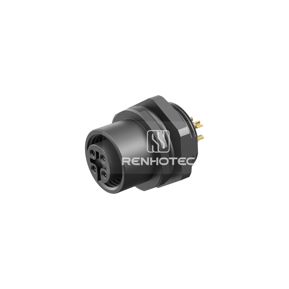 Products > Sensor Connector > M12 Series > M12 D Coded > M12 4 Pin Female Straight Panel Mount Receptacle, D Code Rear Fastened, Solder M15 ,Nylon Shell