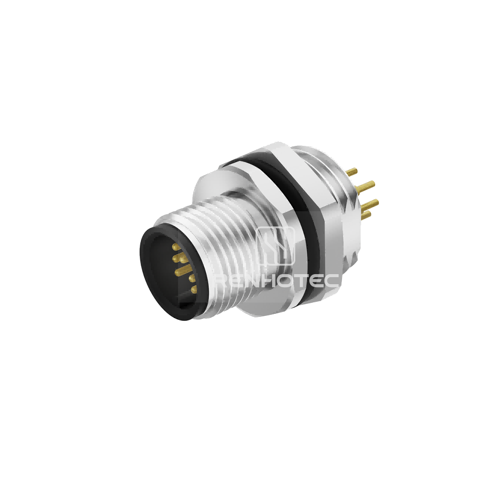 High-quality M12 male panel mounting receptacle with 6 positions and A code. This receptacle is rear fastened and straight PCB mounted, making it a reliable choice for various applications.