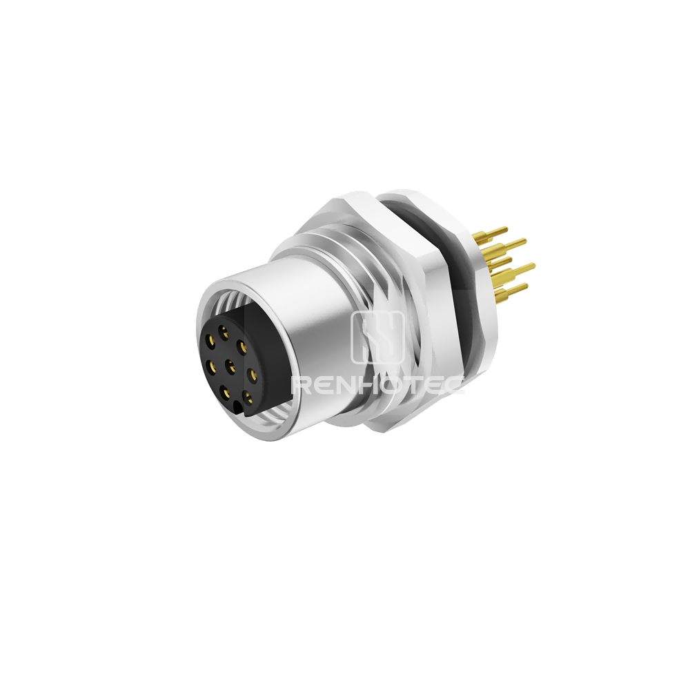 This M12 Female Panel Mounting Receptacle features 8 positions with A code connection, front fastened straight design for easy PCB installation, and M16 size compatibility.