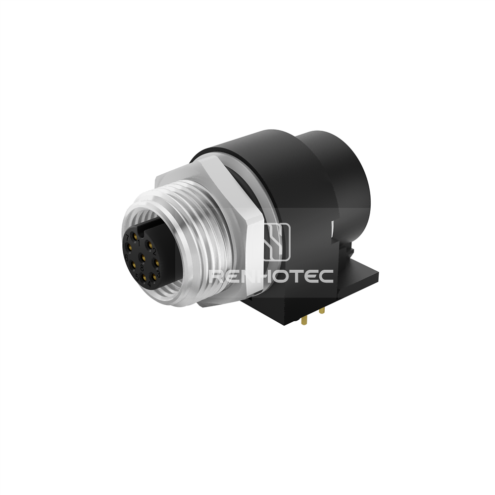 Products > Sensor Connector > M12 Series > M12 A Coded > M12 Panel Mount Receptacle A-Code 12 Pin Female Angled - Front Fastened, PCB, with GND