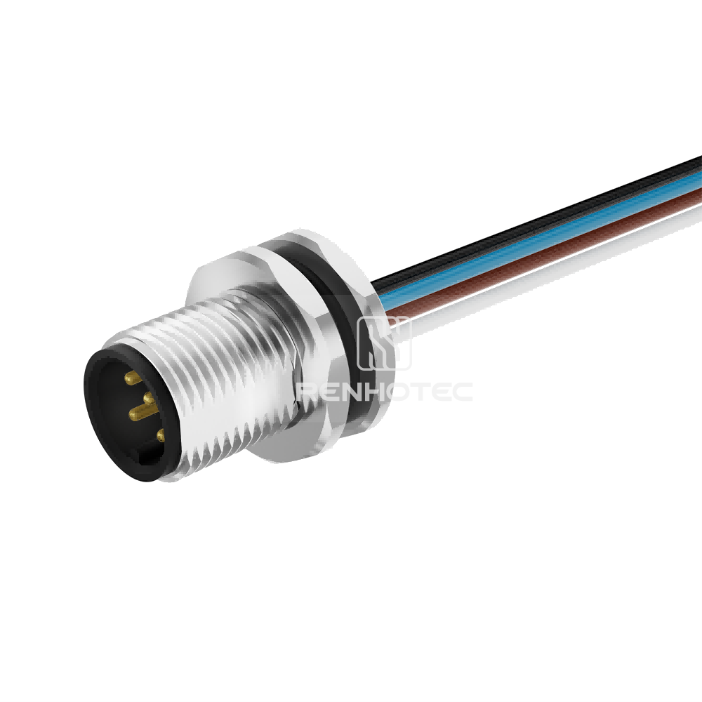 Products > Sensor Connector > M12 Series > M12 D Coded > M12 Panel Mount Receptacle D-Code 4 Pin Male Straight - Front Fastened, with Wires, M12x1.0
